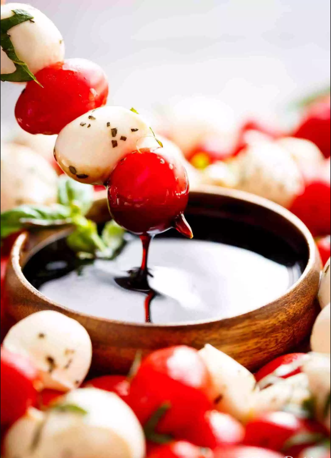 To serve, pláce the bowl of bálsámic gláze in the centre of the wreáth. Árránge toothpicks áround ánd underneáth the tomáto ánd cheese bálls, with the shárp ends towárd the middle of the pláte.